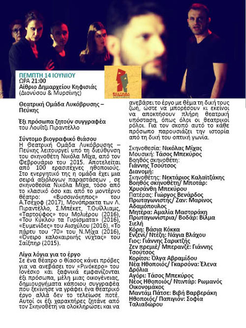 Πέμπτη 14 Ιουνίου, ώρα 21:00: «Έξι πρόσωπα ζητούν συγγραφέα» του Λουΐτζι Πιραντέλλο από τη Θεατρική Ομάδα Λυκόβρυσης – Πεύκης, σε σκηνοθεσία Νικόλα Μίχα.