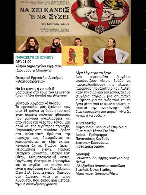 Παρασκευή 15 Ιουνίου, ώρα 21:00: «Να ζει κανείς ή να συζεί?» βασισμένο στο έργο του Lawrence Casler «Μια βραδιά στο Θέατρο» από το Θεατρικό Εργαστήρι Διστόμου «Θεατροφρένεια», σε σκηνοθεσία Τάσου Σταθά.