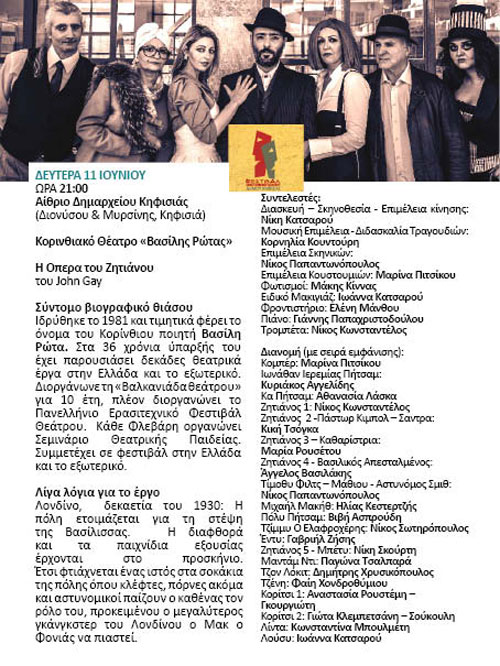 Δευτέρα 11 Ιουνίου, ώρα 21:00: «H Όπερα του Ζητιάνου» του Τζον Γκέι από το Κορινθιακό Θέατρο «Βασίλης Ρώτας», σε σκηνοθεσία Νίκης Κατσαρού.