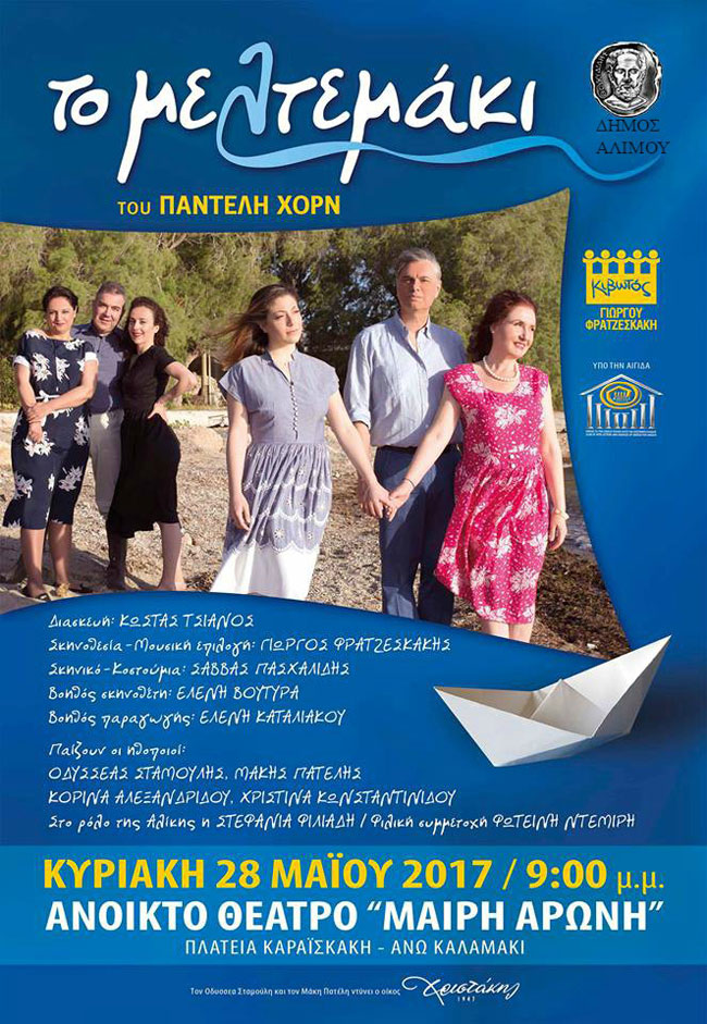 Την Κυριακή 28 Μαίου και ώρα 21.00μμ στο Ανοικτό Θέατρο «Μαίρη Αρώνη» (Πλατεία Καραϊσκάκη στο Άνω Καλαμάκι) θα πραγματοποιηθεί η θεατρική παράσταση «Το Μελτεμάκι» του Παντελή Χόρν σε σκηνοθεσία Γιώργου Φρατζεσκάκη.