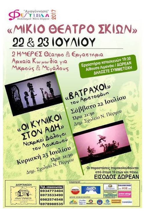 Το Σάββατο και την Κυριακή 22 και 23 Ιουλίου, στο Δημοτικό Σχολείο Νέο Πύργου στις 21.30 το βράδι, περιμένουμε όλους τους μικρούς μας φίλους που είναι άνω των 10 ετών, να απολαύσουν Θέατρο Σκιών με τον Αριστοφάνη και τον Λουκιανό!