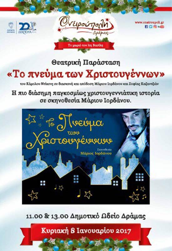 «Το πνεύμα των Χριστουγέννων» του Κ. Ντίκενς, η πιο διάσημη παγκοσμίως χριστουγεννιάτικη ιστορία θα παρουσιαστεί στο Δημοτικό Ωδείο Δράμας την Κυριακή 8 Ιανουαρίου 2017 σε δύο παραστάσεις στις 11 το πρωί και στις 13.00 το μεσημέρι. Μία θεατρική μουσική παράσταση, σε σκηνοθεσία Μάριου Ιορδάνου, που απευθύνεται σε παιδιά όλων των ηλικιών αλλά και ενήλικες!