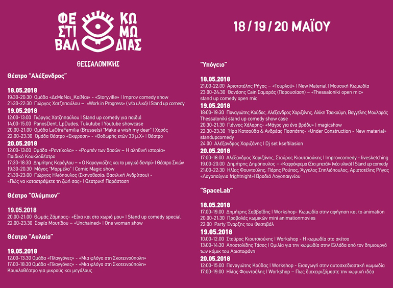 Ένα μοναδικό τριήμερο γέλιου με θέατρο, stand up comedy, improv comedy, comix – σκίτσο, χορό, θέατρο σκιών, κουκλοθέατρο, παιδικό θέατρο, μουσική κωμωδία, μαγικά, λογοπαίγνια, internet – youtube, animation, workshops και ομιλίες.