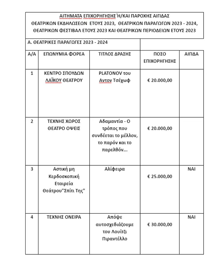 Οι πίνακες με τα ποσά επιχορήγησης ή/και παροχή αιγίδας.