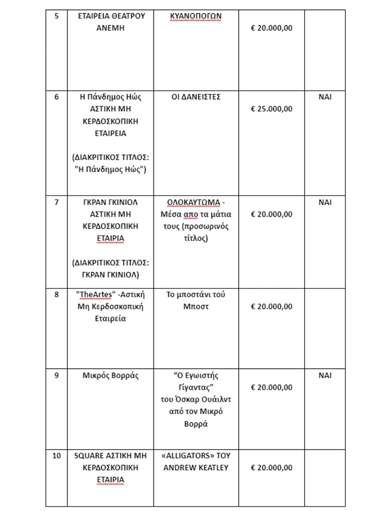 Όπως αναφέρει η ανακοίνωση του ΥΠΠΟΑ, η Γνωμοδοτική Επιτροπή Θεάτρου αποτελούμενη από τους Δρ. Άννα Σταυρακοπούλου (Αναπληρώτρια Καθηγήτρια Θεατρολογίας, Τμήμα Θεάτρου, ΑΠΘ), Δρ. Αμαλία Κοντογιάννη (Δρα Θεατρολογίας / Προϊσταμένη του Τμήματος Καλλιτεχνικού Έργου και Δραματολογίου του ΚΘΒΕ), Νίκο Ορφανό (Ηθοποιό, Σκηνοθέτη, Καλλιτεχνικό Διευθυντή ΔΗΠΕΘΕ Ρούμελης), Γαβριέλλα – Πηνελόπη Τριανταφύλλη (Διευθύντρια Προγραμματισμού και Παραγωγής, Κέντρο Πολιτισμού Ίδρυμα Σταύρος Νιάρχος), Έλενα Πέγκα (Συγγραφέα, σκηνοθέτη), Τώνη Λυκουρέση (Σκηνοθέτη), Σοφία Παντουβάκη (Αναπληρώτρια Καθηγήτρια Ενδυματολογίας, Aalto University και Σκηνογράφο) και Μάριο Κωστάκη, Προϊστάμενο της Γενικής Διεύθυνσης Σύγχρονου Πολιτισμού του ΥΠΠΟ, γνωμοδότησε θετικά υπέρ της επιχορήγησης και παραχώρησης αιγίδας κατά περίπτωση σε 91 φορείς.