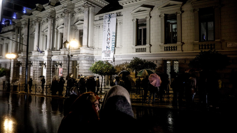 Στο σημείο ήταν συγκεντρωμένοι σπουδαστές δραματικών σχολών και ηθοποιοί, οι οποίοι διαμαρτύρονται για το Προεδρικό Διάταγμα που εξισώνει τα πτυχία τους με απολυτήρια Λυκείου.