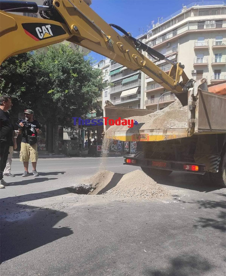 Σύμφωνα με πληροφορίες ο Δήμος Θεσσαλονίκης με έξι κυβικά αμμοχάλικο κάλυψε την τρύπα ενώ τις επόμενες ώρες αναμένεται να τοποθετηθεί μια μεταλλική πλάκα. Οι ίδιες πληροφορίες αναφέρουν ότι μέσα στο Σαββατοκύριακο θα καλύψουν την τρύπα με πίσσα.