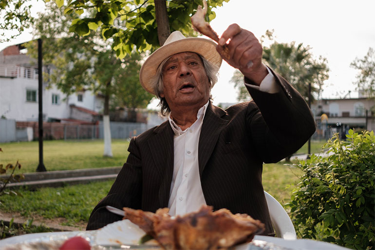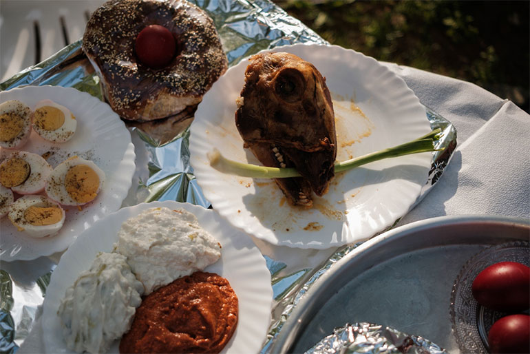 «Δεκαετίες πριν, που οι Ρομά ζούσαν σε αντίσκηνα, την επόμενη μέρα της γιορτής του Αη Γιώργη μαζεύονταν στο κέντρο του συνοικισμού, κάθονταν κάτω σε χαλιά και η κάθε οικογένεια έφερνε ένα ταψί όπου είχε μέσα το κεφαλάκι από το αρνί που είχαν ψήσει στη γιορτή, στολισμένο με ένα κρεμμυδάκι. Στο ταψί υπήρχε επίσης ένα τσουρέκι και κρέατα που είχαν περισσέψει από την προηγούμενη μέρα».