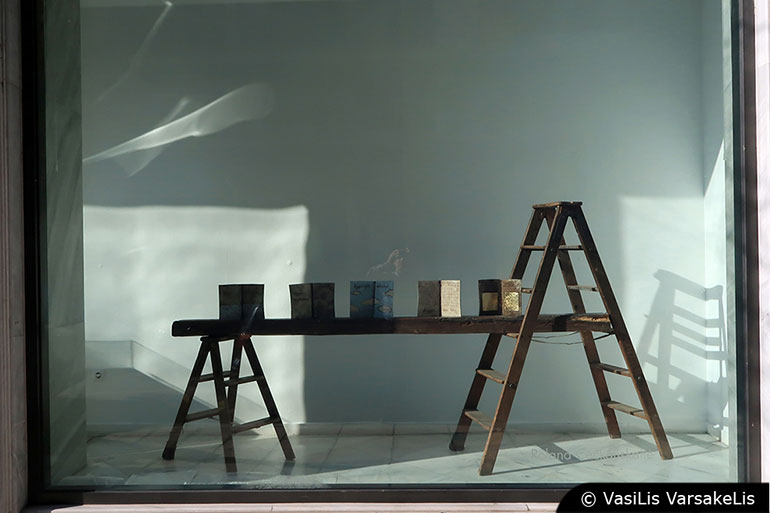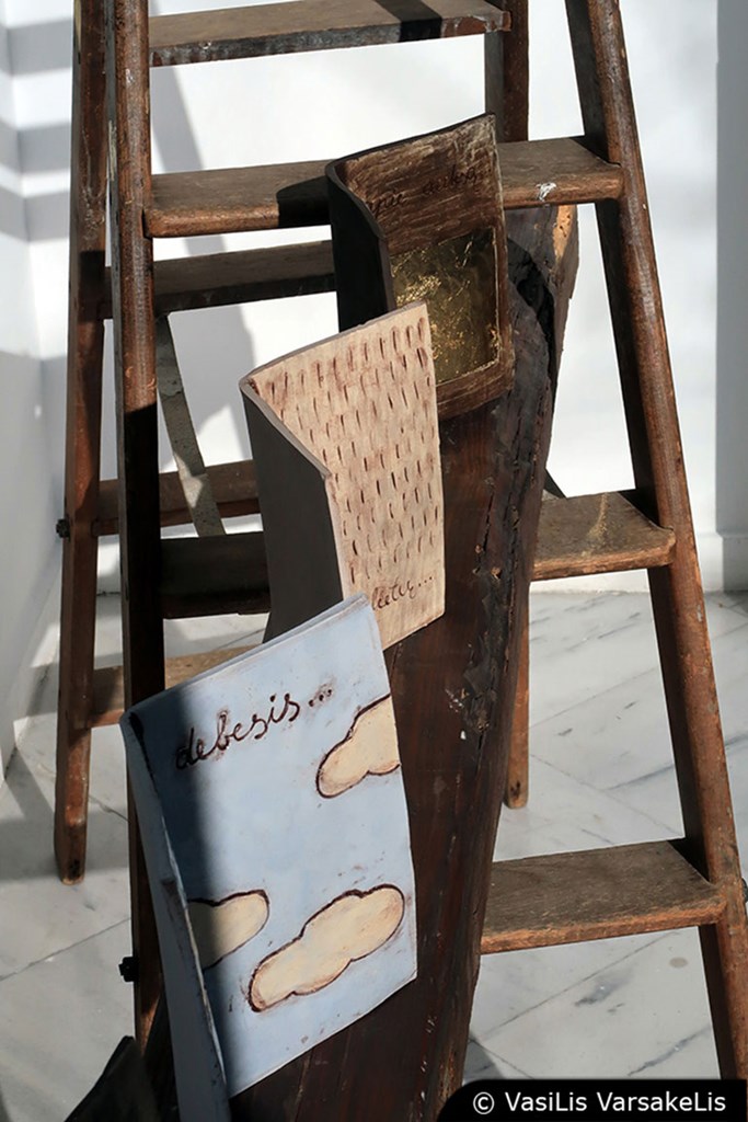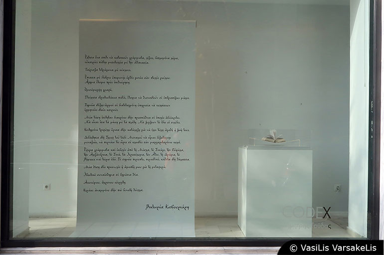 «Ἔχτισα ἕνα σπίτι νὰ κατοικοῦν γράμματα, λέξεις, διπλωμένα λόγια, εὐκαιρίες πίστης μεσοτοιχία μὲ τὴν ἀθανασία». Με αυτά τα λόγια ξεκινά το ποίημα της δημοσιογράφου Βικτωρίας Καβουριάρη, το οποίο έγραψε για τις ανάγκες της έκθεσης.