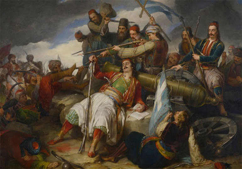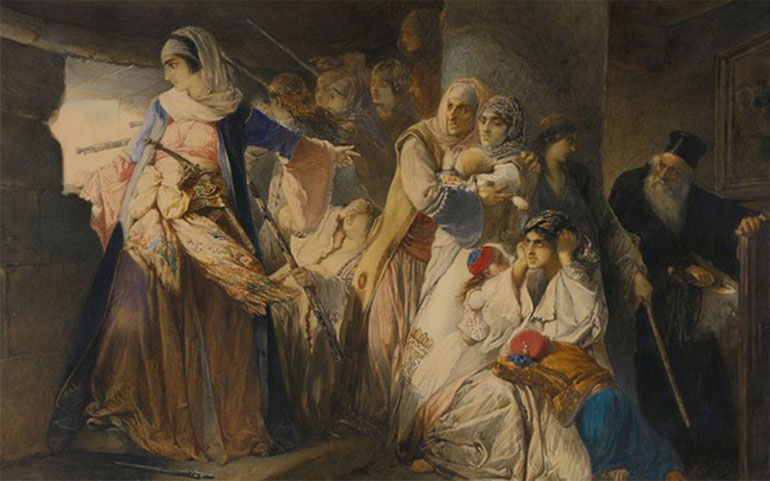 Από το ελληνικό τοπίο με τα λείψανα του ένδοξου παρελθόντος, που αποτέλεσε πόλο έλξης των ξένων περιηγητών του 17ου αιώνα, οι καλλιτέχνες σταδιακά ανακάλυψαν τους υπόδουλους κατοίκους της ελληνικής γης και συστρατεύτηκαν στον Αγώνα της Ανεξαρτησίας. Ο μνημειακός πίνακας «Η Ήττα των Τούρκων στην Κλεισούρα του Σουλίου», του βρετανού Ντένις Ντίγκτον το 1823, χρονιά που παρουσιάστηκε στην ετήσια έκθεση της Βασιλικής Ακαδημίας, απεικονίζει μία πολυπρόσωπη πολεμική σκηνή με τους Σουλιώτες να ορμούν από τις απόκρημνες πλαγιές των βουνών τους στη μάχη της ελευθερίας, ενώ μέσα από μία στενή χαράδρα σκεπασμένη από σύννεφο καπνού προβάλει ο Λάμπρος Τζαβέλλας και πλάι του η ατρόμητη Μόσχω, η γυναίκα του, κρατώντας στο ένα χέρι της το καριοφύλι. Από ψηλά, Σουλιώτες ρίχνουν κομμάτια βράχων, τα οποία συνθλίβουν τους Οθωμανούς που βρίσκονται στους πρόποδες.