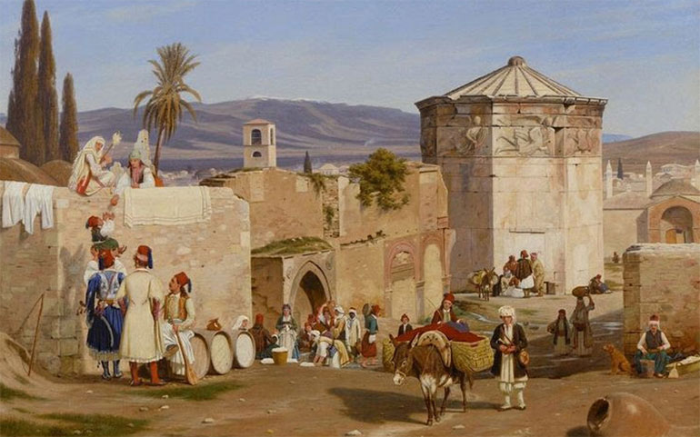 Μετά την Επανάσταση, οι Ευρωπαίοι καλλιτέχνες επισκέπτονται την Ελλάδα, γνωρίζουν επιζήσαντες αγωνιστές, ζωγραφίζουν πορτρέτα τους, απαθαναντίζουν καθημερινά στιγμιότυπα νησιών, πόλεων και κατοίκων. Μία θαυμάσια μικρογραφική και ρεαλιστική σύνθεση της αθηναϊκής καθημερινότητας αποδίδει ο Δανός Martinus Christian Wesseltoft Rørbye στην ελαιογραφία «Η Περιοχή γύρω από τον Πύργο των Ανέμων» (1839).