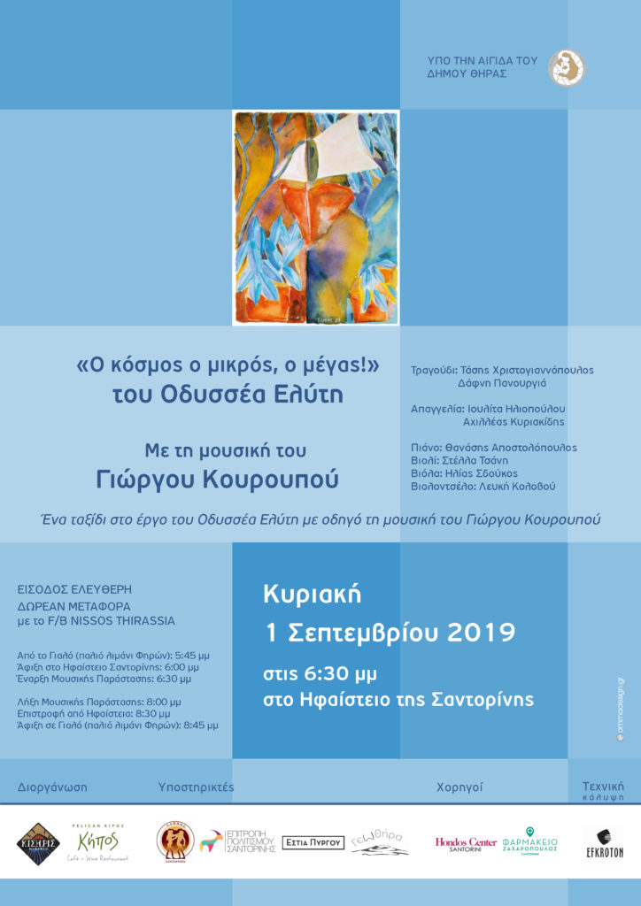 Ένα ιδιαίτερο αφιέρωμα στον Οδυσσέα Ελύτη έχει προγραμματιστεί για το απόγευμα της Κυριακής 1 Σεπτεμβρίου, στις 18:30, πάνω στο Ηφαίστειο της Σαντορίνης. Τίτλος της μουσικής παράστασης είναι “Ο κόσμος ο μικρός, ο μέγας!” και η είσοδος θα είναι ελεύθερη.
