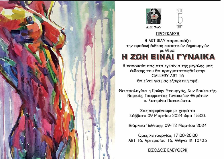 Σας περιμένουμε στα εγκαίνια της έκθεσης μας με θέμα «Η ΖΩΗ ΕΙΝΑΙ ΓΥΝΑΙΚΑ» 9 Μαρτίου 2024 και ώρα 18:00 η οποία θα πραγματοποιηθεί