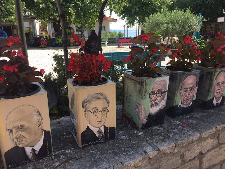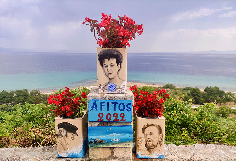 Ο Τσαρούχης, με βλέμμα αινιγματικό, παρακολουθεί να περνούν από μπροστά του, στα γραφικά σοκάκια της Αφύτου (ή Αθύτου), οι περιπατητές. Δίπλα του, στέκουν ο Καβάφης, ο Ελύτης, ο Σεφέρης, ο Αγγελόπουλος, η Καρέζη και ο Χριστιανόπουλος. Εκατοντάδες πορτρέτα κορυφαίων Ελλήνων μουσικών, ηθοποιών, σκηνοθετών, ποιητών και λογοτεχνών, έργα που δημιούργησαν εθελοντές ζωγράφοι από όλη την Ελλάδα, κοσμούν τις γνωστές πλέον γλάστρες από τενεκέδες τυριού στον παραδοσιακό οικισμό της Χαλκιδικής.