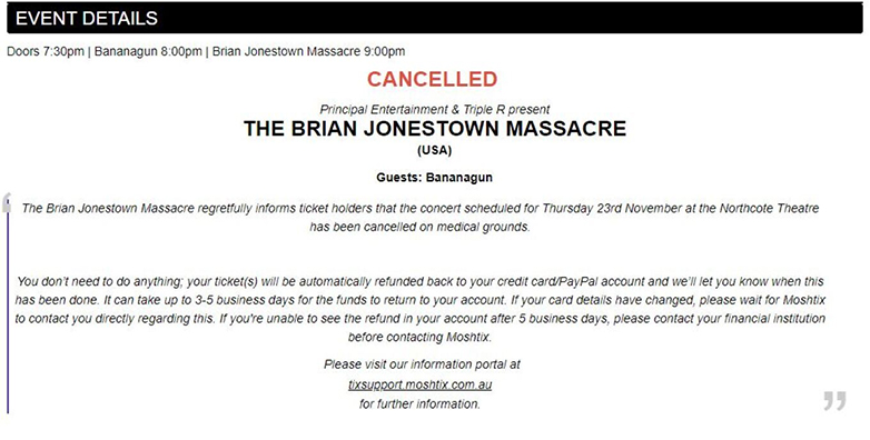 Ως αποτέλεσμα του καβγά της Τρίτης, το συγκρότημα ακύρωσε τις υπόλοιπες εμφανίσεις του στην Αυστραλία, σύμφωνα με την επίσημη ιστοσελίδα του. Τα μέλη επικαλέστηκαν ιατρικούς λόγους.