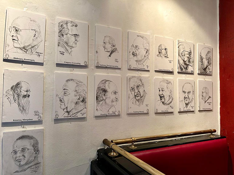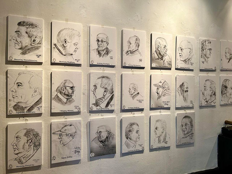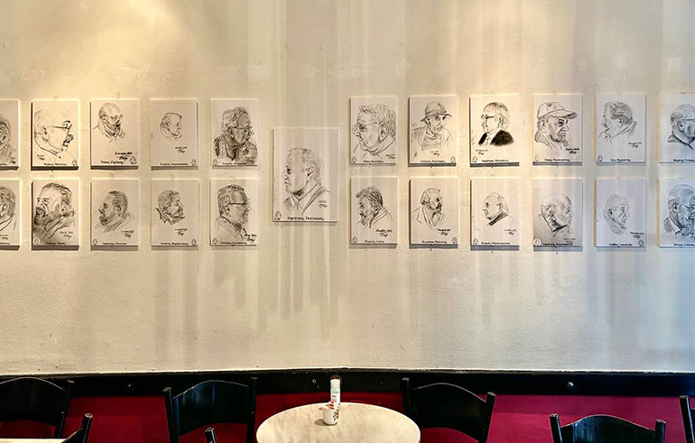 Δημοφιλείς άνδρες από τον χώρο της πολιτικής, των γραμμάτων και των τεχνών, αλλά και άγνωστοι στον ίδιο άνθρωποι, που έτυχε να κάθονται στο οπτικό του πεδίο την ώρα που κρατούσε το μολύβι του, βρίσκονται …κρεμασμένοι στον αριστερό τοίχο του καταστήματος. Στην απέναντι πλευρά, την έκθεση συμπληρώνουν τα πορτρέτα των θαμώνων του καφέ-μπαρ που φιλοξενεί την έκθεση με τίτλο «Προσωπογραμμές λαξευμένες επί χάρτου».