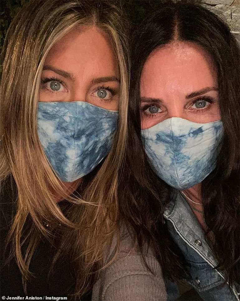 Στη δεύτερη φωτογραφία της ανάρτησης, η Τζένιφερ Άνιστον ποζάρει με μάσκα μαζί με την φίλη της και συμπρωταγωνίστριά της στη σειρά «Τα Φιλαράκια», Κόρτνεϊ Κόξ, φορώντας φυσικά μάσκες.