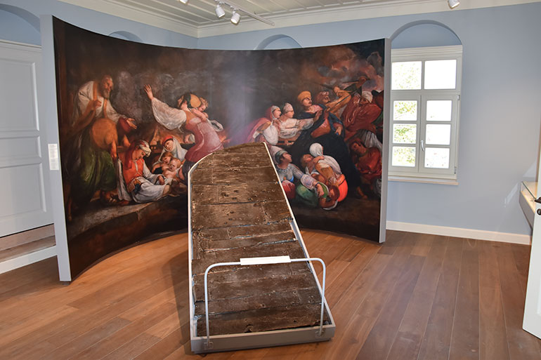Πρώτα το ένα φύλλο της «λαβωμένης» από τα βόλια των Οθωμανών θύρας του μοναστηριού που προβάλλεται σε τμήμα αντιγράφου της τοιχογραφίας με θέμα τη σφαγή των Χίων, η οποία μεγέθους σχεδόν 30 τετραγωνικών μέτρων βρίσκεται στο Doric House του Bath της Μεγάλης Βρετανίας. Αλλά και εφημερίδες εποχής απόδειξη και αυτές του κύματος φιλελληνισμού που προκάλεσε η σφαγή των Χιωτών τον Απρίλιο του 1822. «Η Ιερά Μητρόπολη Χίου, Ψαρών και Οινουσσών, υποστηρίζει ο Μητροπολίτης κ. Μάρκος, δημιούργησε το Μουσείο ως γνώση της Ιστορίας, ως προσκύνημα της μεγάλης θυσίας, ως έμπνευση από τα θρησκευτικά και εθνικά ιδανικά. Το μοναστήρι του Αγίου Μηνά πέρα από τον εκκλησιαστικό και πνευματικό χαρακτήρα του είναι ένα σύμβολο, σύμβολο πίστεως στο Χριστό, σύμβολο Ελληνικής ελευθερίας, σύμβολο θυσίας. Είναι αναντίρρητα η κατ’ εξοχήν και υπέροχη έμπνευση του Σολωμικού στίχου ‘απ’ τα κόκκαλα βγαλμένη των Ελλήνων τα ιερά’» καταλήγει ο κ. Μάρκος.
