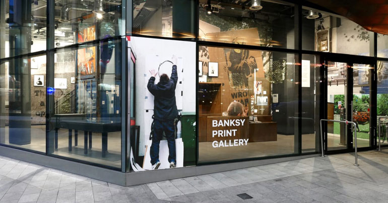 Ο εικαστικός της τέχνης του δρόμου από το Μπρίστολ είναι κυρίως γνωστός για τα στένσιλ του, τα περισσότερα μαυρόασπρα, όπως το «Girl with Balloon», που δείχνει ένα μικρό κορίτσι ν’ αφήνει στον αέρα ένα κόκκινο μπαλόνι σε σχήμα καρδιάς ή το «Flower Thrower», που παρουσιάζει έναν ταραξία να ετοιμάζεται να πετάξει ένα μπουκέτο λουλούδια, δύο έργα που υπάρχουν μέσα στην έκθεση.