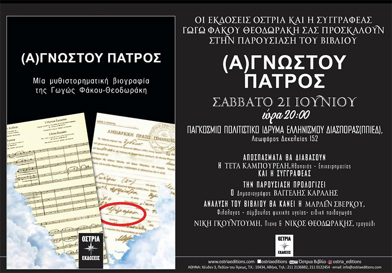 Παρουσίαση του βιβλίου «(Α)γνώστου πατρός» της Γωγώς Φάκου-Θεοδωράκη θα πραγματοποιηθεί το Σάββατο 21/6 στις 20.00 στο Παγκόσμιο Πολιτιστικό Ίδρυμα Ελληνισμού Διασποράς (ΠΠΙΕΔ) στη Νέα Φιλαδέλφεια.