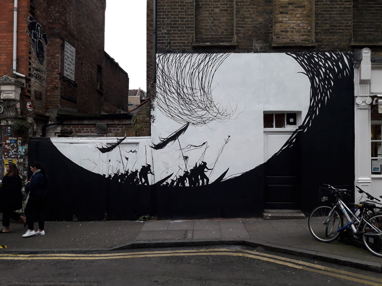 Σιλουέτες που βαδίζουν σε άγνωστους προορισμούς σε έναν δυστοπικό κόσμο, ζωγραφίζει σε τοίχους ο Νταβίντ ντε λα Μάνο. Ευρισκόμενος στο Λονδίνο για την τρίτη σόλο έκθεσή του, ο Ισπανός καλλιτέχνης δρόμου διακόσμησε κάποιους δρόμους της βρετανικής πρωτεύουσας με άλλη μία σειρά έργων του, με τίτλο «Ακυβέρνητο» (σκάφος, προφανώς).