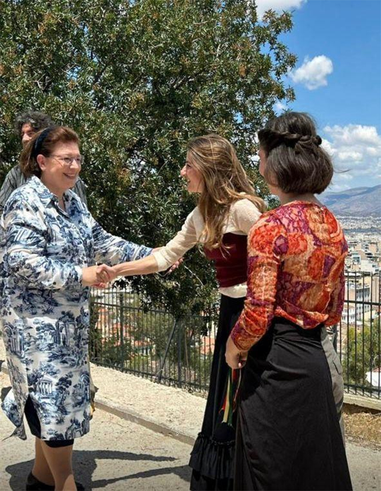 Η Υπουργός Πολιτισμού Λίνα Μενδώνη με μέλη της μουσικής ομάδας Encardia