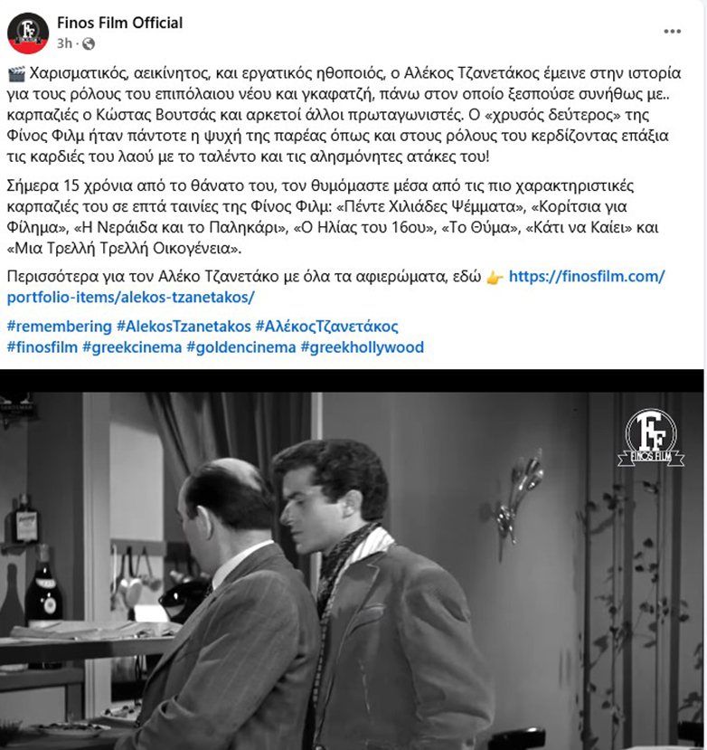 «Χαρισματικός, αεικίνητος, και εργατικός ηθοποιός, ο Αλέκος Τζανετάκος έμεινε στην ιστορία για τους ρόλους του επιπόλαιου νέου και γκαφατζή, πάνω στον οποίο ξεσπούσε συνήθως με.. καρπαζιές ο Κώστας Βουτσάς και αρκετοί άλλοι πρωταγωνιστές. Ο “χρυσός δεύτερος” της Φίνος Φιλμ ήταν πάντοτε η ψυχή της παρέας όπως και στους ρόλους του κερδίζοντας επάξια τις καρδιές του λαού με το ταλέντο και τις αλησμόνητες ατάκες του» γράφει η ομάδα της θρυλικής εταιρείας παραγωγής στην περιγραφή της δημοσίευσης.