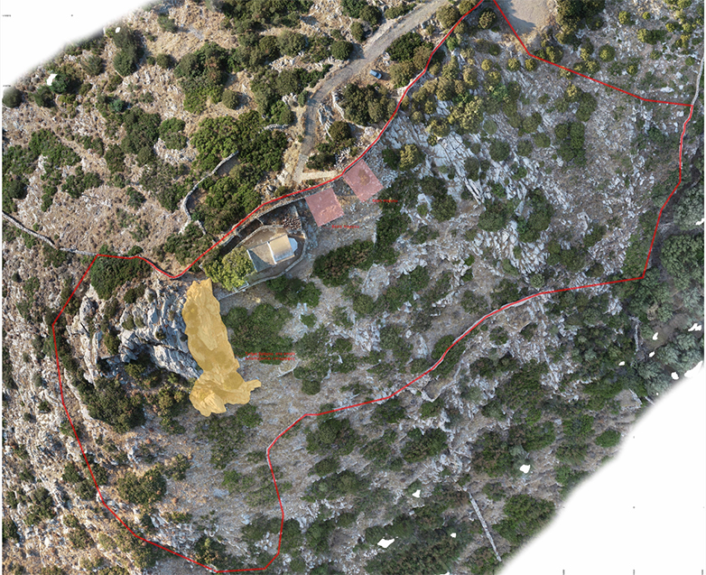 Αεροφωτογραφία του Άη Γιώργη στη θέση Ακρόπολη. Με κόκκινο σημειώνεται η πορεία του τείχους