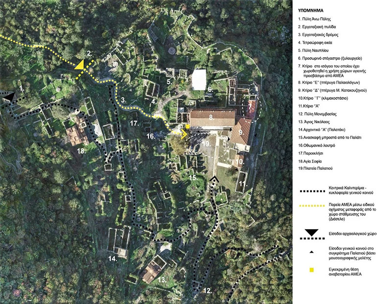 Συγκεκριμένα, σύμφωνα με την ίδια ανακοίνωση, καθολική πρόσβαση παρέχουν στα ΑμεΑ και στα εμποδιζόμενα άτομα οι διαμορφώσεις του περιβάλλοντος χώρου και το δίκτυο των διαδρομών. Αποκαθίσταται η πλατεία, έμπροσθεν του Ανακτόρου, όπως είχε διαμορφωθεί στο α΄ μισό του 15ου αι. -ο χώρος λειτουργούσε ως διοικητικό κέντρο, προσωρινή έδρα της αυτοκρατορικής διοίκησης- ενώ η υφιστάμενη ατραπός δέχεται βελτιωτικές παρεμβάσεις, ώστε να διασφαλιστεί η πρόσβαση στο Παλάτι σε άτομα μειωμένης κινητικότητας, με ειδικό όχημα μεταφοράς και μέσω εξωτερικού αναβατορίου. Όλοι οι χώροι του μνημείου καθίστανται απολύτως επισκέψιμοι.