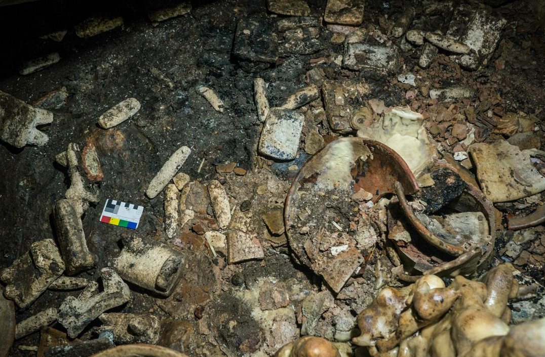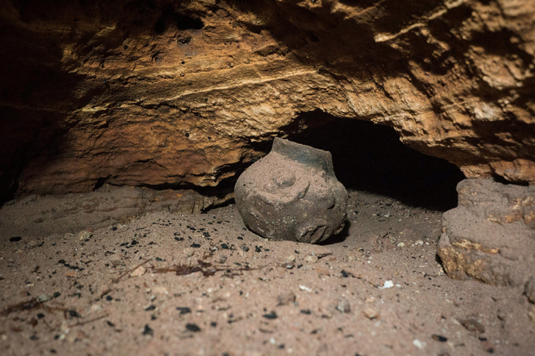 Στη σπηλιά που βρίσκεται περίπου 20 μέτρα κάτω από την επιφάνεια της γης, βρέθηκαν πολλά αρχαία αντικείμενα: Aπό πήλινα δοχεία και εγχειρίδια, μέχρι μάσκες και αγαλματίδια θεοτήτων, αλλά και ίχνη από οστά.