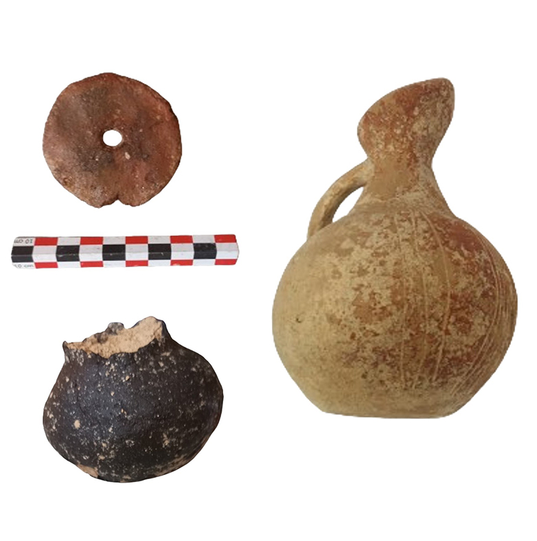 (ΕΙΚ.15): Κτερίσματα της Πρωτοκυκλαδικής ταφής (δισκοειδές σφονδύλι, πήλινη φιάλη, ραμφοειδόστομη πρόχους)