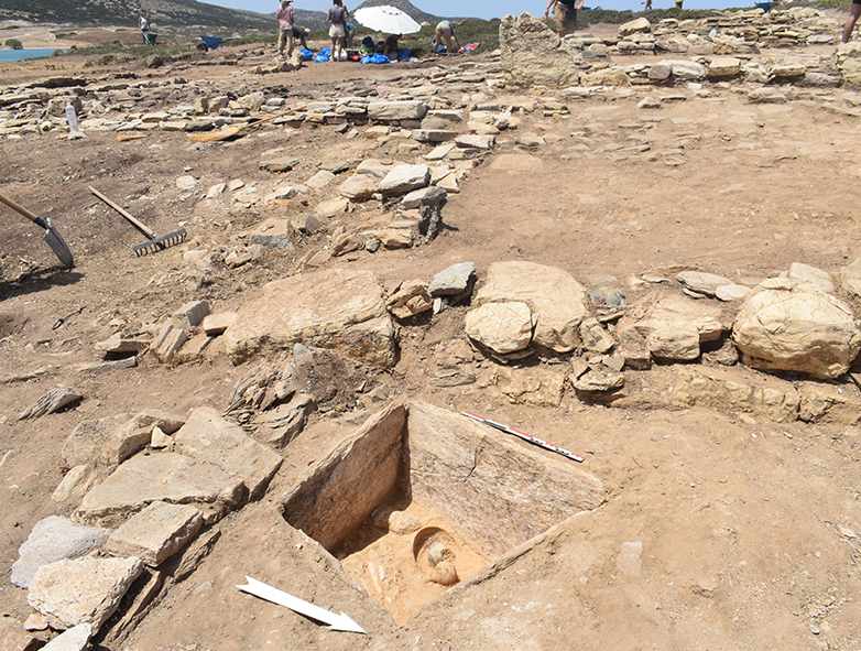 Πρωτοκυκλαδική ταφή: Η φετινή ανασκαφική περίοδος μας επεφύλασσε μια μεγάλη έκπληξη κατά τη διερεύνηση του Συγκροτήματος ΒΤ, καθώς κατά τη διερεύνηση του εσωτερικού του Χώρου 5 στο ΒΔ άκρο του Συγκροτήματος, εντοπίστηκε τραπεζοειδής, κιβωτιόσχημη κατασκευή από κάθετα τοποθετημένες λίθινες πλάκες (Εικ. 13).