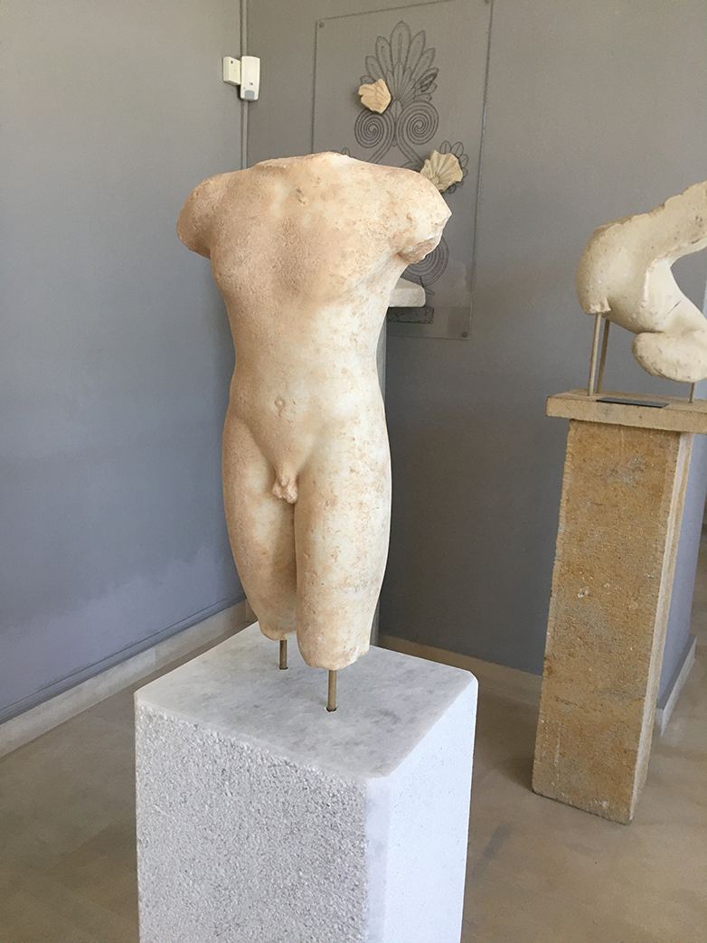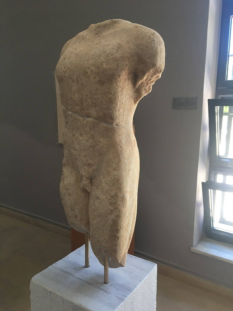 (ΕΙΚ.4): Κούρος παριανού εργαστηρίου που βρέθηκε εντοιχισμένος σε β΄χρήση σε τοίχο της ύστερης αρχαιότητας, θραυσμένος σε τρία κομμάτια (β΄μισό 6ου αι.π.Χ.). Εκτίθεται στο Αρχαιολογικό μουσείο της Πάρου μετά τη συγκόλληση του