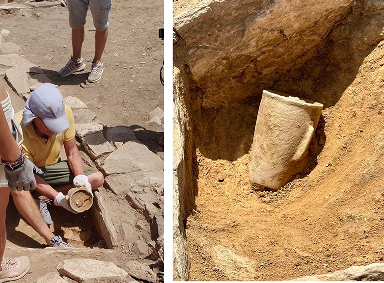 Η ανασκαφή του λεγόμενου «Κτηρίου Ω», στο περιβάλλον του οποίου το 2023 είχαν αποκαλυφθεί τα θραύσματα τουλάχιστον τριών κούρων, ενός ανδρικού αγάλματος αυστηρού ρύθμου, μαρμάρινων βάσεων και ειδωλίων και το οποίο είχε θεωρηθεί ως ένα είδους πρόπυλου (Εικ.2, 3, 4) συνεχίστηκε και φέτος με τη διερεύνηση της μεγάλης κατάρρευσης στο εσωτερικό του κτίσματος, ανάμεσα στους τοίχους Τ1 και Τ3. Από τη μελέτη της στρωματογραφίας και της κεραμεικής φαίνεται πολύ πιθανό πως οι δύο τοίχοι γνώρισαν δύο φάσεις κατασκευής και επισκευής, με την πρωιμότερη στον 6ο αι.π.Χ.