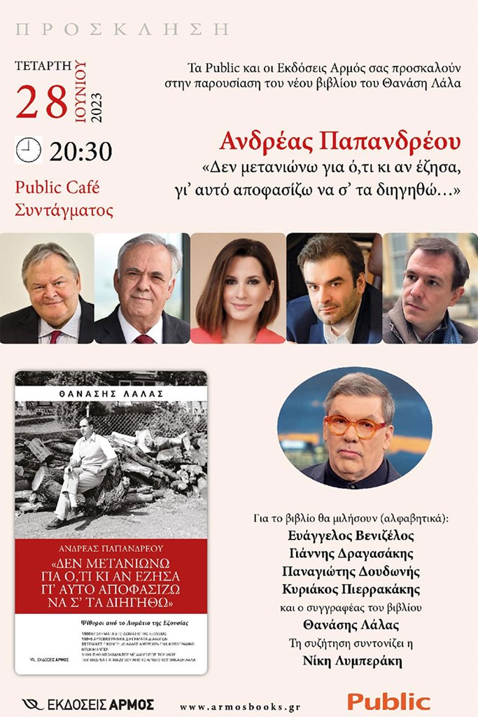 Τα Public και οι εκδόσεις Αρμός παρουσιάζουν το νέο βιβλίο του Θανάση Λάλα «Ανδρέας Παπανδρέου: Δεν μετανιώνω για ό,τι κι αν έζησα γι’ αυτό αποφασίζω να σ’ τα διηγηθώ». – Ψίθυροι από το Δωμάτιο της Εξουσίας, την Τετάρτη 28 Ιουνίου 2023 και ώρα 20.30 στο Public Café Συντάγματος. (Καραγιώργη Σερβίας 1, Αθήνα).