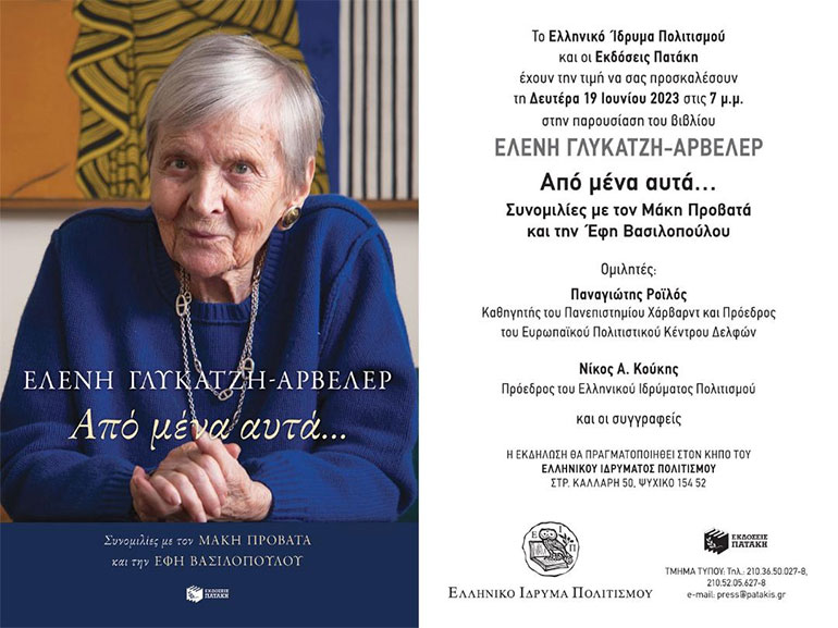 Το Ελληνικό Ίδρυμα Πολιτισμού και οι εκδόσεις Πατάκη έχουν την τιμή να προσκαλέσουν το κοινό στην παρουσίαση του βιβλίου «Ελένη Γλύκατζη-Αρβελέρ, Από μένα Αυτά. Συνομιλίες με τον Μάκη Προβατά και την Έφη Βασιλοπούλου».