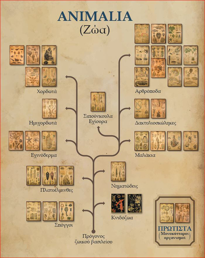 Η έκθεση αναδεικνύει την τεράστια ποικιλότητα του ζωικού βασιλείου μέσα από μια συλλογή επιτοίχιων απεικονίσεων ζωολογίας, όπου καταγράφονται με λεπτομέρεια τα εξωτερικά μορφολογικά και ανατομικά χαρακτηριστικά αντιπροσωπευτικών οργανισμών, από πολλές ζωικές ομάδες.