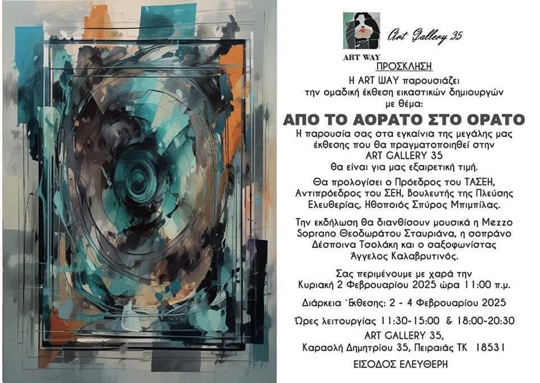 Η ART WAY και η εξαιρετική καλλιτέχνις- φωτογράφος Αφροδίτη Δρακοπούλου Σάρδη παρουσιάζουν την Κυριακή 2 Φεβρουαρίου την ομαδική έκθεση εικαστικών με θέμα «Από το αόρατο στο ορατό» στην Art Gallery 35 (Καραολή Δημητρίου 35, Πειραιάς).