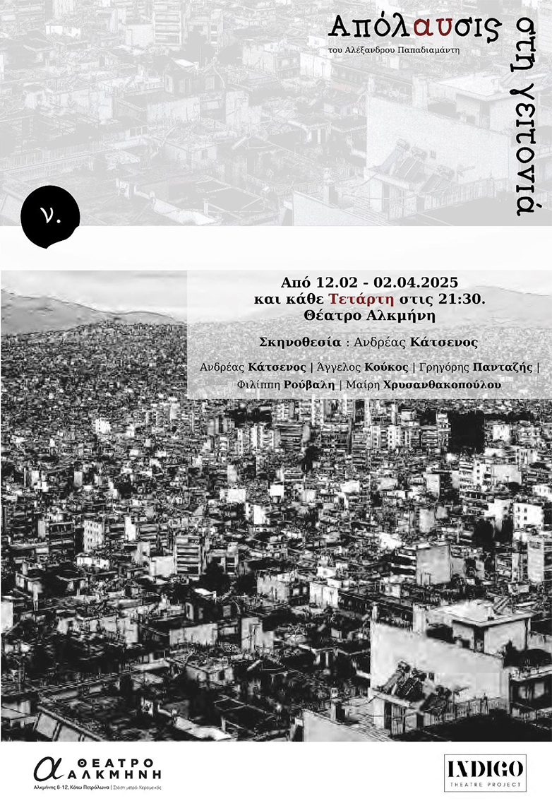 Η παράσταση «Απόλαυσις στη Γειτονιά» του Αλέξανδρου Παπαδιαμάντη ανεβαίνει από την ομάδα Νι, το τελικό από 12.02 – 02.04.2025 και κάθε Τετάρτη στις 21:30 στο Θέατρο Αλκμήνη (Αλκμήνης 8-12, Αθήνα 118 54)