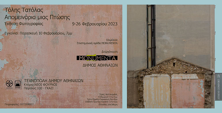 Εγκαινιάζεται την Παρασκευή 10 Φεβρουαρίου 2023, στις 7μ.μ., η έκθεση φωτογραφίας του εικαστικού Τόλη Τατόλα με τίτλο «Απομεινάρια μιας Πτώσης», που διοργανώνουν η MONUMENTA και ο Δήμος Αθηναίων, στην αίθουσα Νέοι Φούρνοι της Τεχνόπολης Δήμου Αθηναίων στο Γκάζι, με την ευγενική παραχώρηση της Τεχνόπολης Δήμου Αθηναίων.