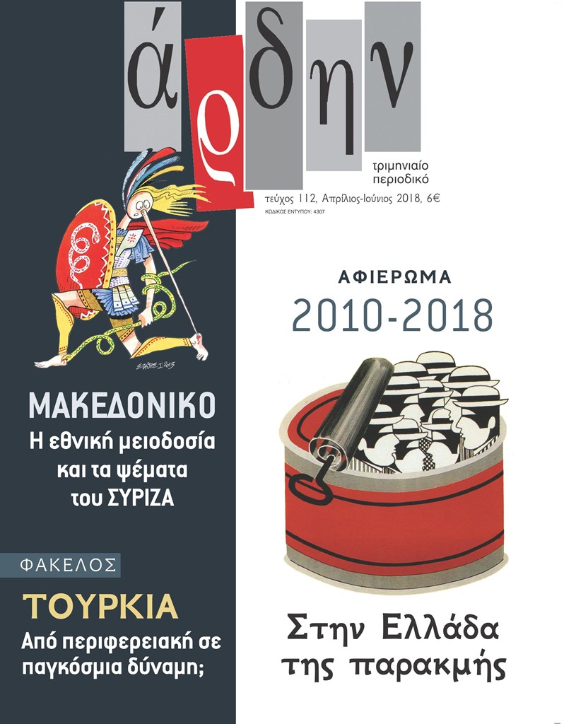 Κυκλοφορεί σε βιβλιοπωλεία και περίπτερα το νέο τεύχος του Άρδην (τ. 112) με αφιέρωμα στα εννιά χρόνια της κρίσης και το Μακεδονικό με ψέματα και την εθνική μειοδοσία του ΣΥΡΙΖΑ.