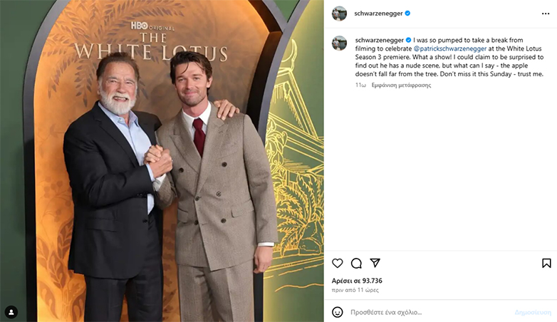«Ήμουν τόσο ενθουσιασμένος που έκανα ένα διάλειμμα από τα γυρίσματα για να γιορτάσω τον [Πάτρικ Σβαρτσενέγκερ] στην πρεμιέρα της 3ης σεζόν του “White Lotus”», έγραψε ο σταρ σε ανάρτησή του στο Instagram και τη συνόδευσε με ένα στιγμιότυπο από την πρεμιέρα της σειράς όπου βρέθηκε όλη η οικογένεια.