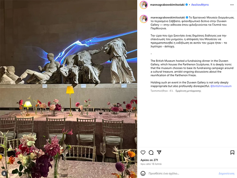 «Το Βρετανικό Μουσείο διοργάνωσε, το περασμένο Σάββατο, φιλανθρωπικό δείπνο στην Duveen Gallery – στην αίθουσα όπου φιλοξενούνται τα Γλυπτά του Παρθενώνα. Την ώρα που έχει ξεκινήσει ένας δημόσιος διάλογος για την επανένωση του μνημείου, η απόφαση του Μουσείου να πραγματοποιηθεί η εκδήλωση σε αυτόν τον χώρο ήταν – το λιγότερο – άστοχη».