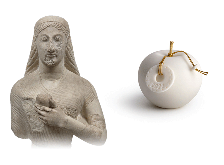 Εμπνευσμένο από το μήλο που κρατά στο χέρι η Κόρη Ακρ. 677, γνωστή ως «Κόρη με το Μήλο». Το μήλο, φρούτο που συνδέεται με τον έρωτα, το γάμο και τη γονιμότητα, η Κόρη το φέρνει ως προσφορά στη θεά Αθηνά. Το έκθεμα χρονολογείται στο 570-560 π.Χ. και βρίσκεται στην αίθουσα της αρχαϊκής Ακρόπολης.