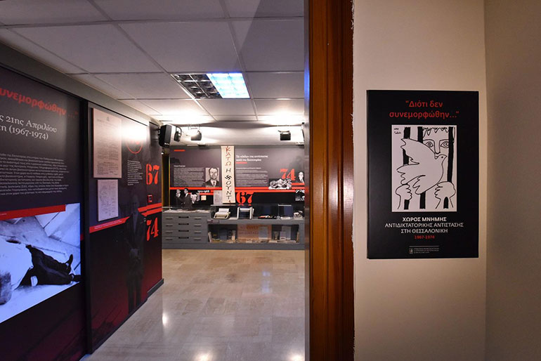 Ο εκθεσιακός Χώρος Μνήμης, με ντοκουμέντα, φωτογραφίες και ενημερωτικά κείμενα από την αντιδικτατορική αντίσταση στη Θεσσαλονίκη, στεγάζεται στο Πολεμικό Μουσείο Θεσσαλονίκης, το κτίριο του οποίου, την περίοδο της δικτατορίας, υπήρξε κολαστήριο ανακρίσεων και βασανισμών για πολλούς αγωνιστές από όργανα του δικτατορικού καθεστώτος.