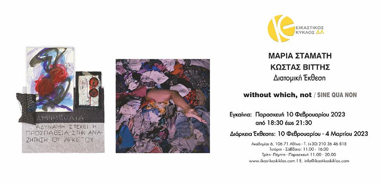 Δύο καλλιτέχνες, με διαφορετική αφετηρία και διαδρομή, εκθέτουν τα έργα τους στον χώρο του «Εικαστικού Κύκλου ΔΛ» από την Παρασκευή 10 Φεβρουαρίου 2023 έως 4 Μαρτίου 2023. Πρόκειται για τη διατομική έκθεση της Μαρίας Σταμάτη και του Κώστα Βίττη με τίτλο «Without Which, Not / Sine Qua Non».
