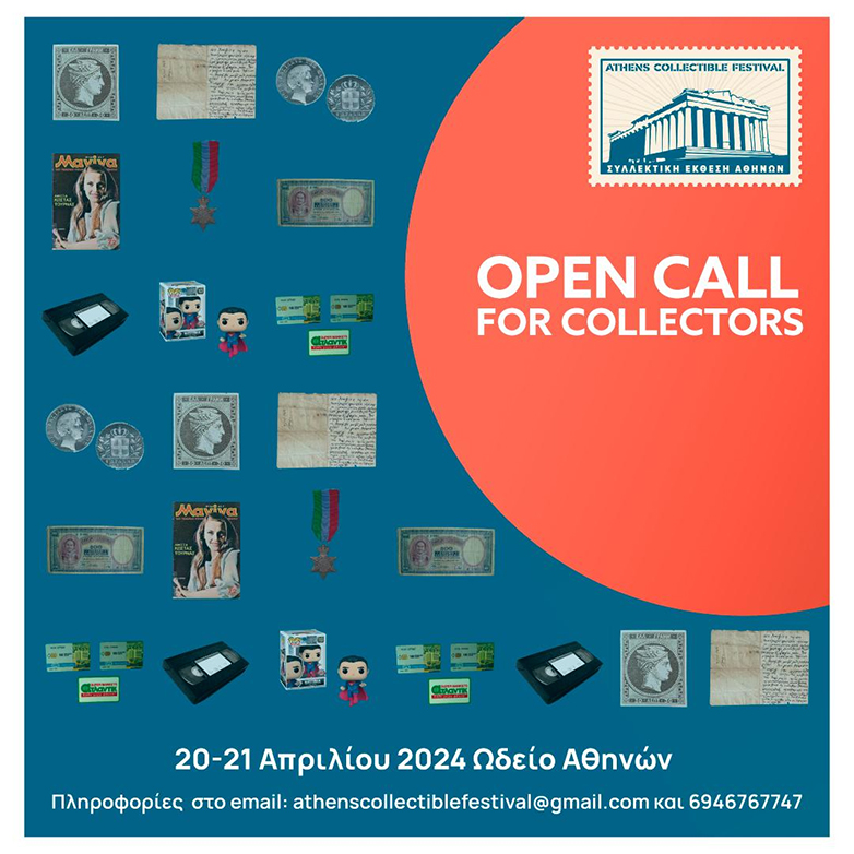 Η μεγαλύτερη συλλεκτική έκθεση στην Αθήνα με νομίσματα – χαρτονομίσματα, γραμματόσημα – φάκελοι, τηλεκάρτες, μετάλλια, παράσημα, βινύλια, παιχνίδια, φωτογραφίες, παλαιά βιβλία, αρχειακό υλικό, αντίκες και κάθε είδους άλλα συλλεκτικά αντικείμενα.