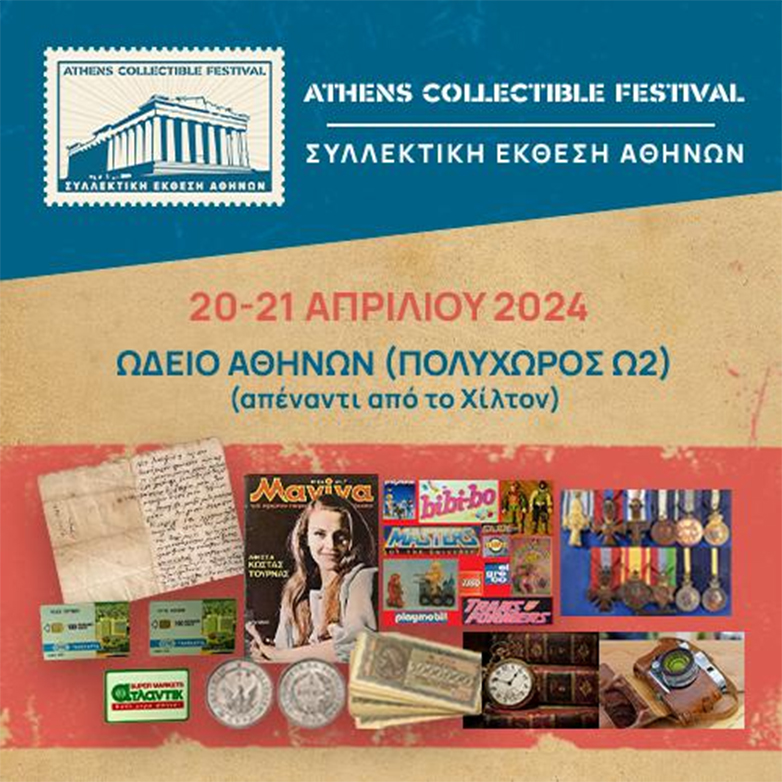 Το «Athens Collectible Festival» η Συλλεκτική Έκθεση Αθηνών, έρχεται στις 20-21 Απριλίου στο Ωδείο Αθηνών ( Πολυχώρος Ω2) για όλους τους λάτρεις συλλεκτισμού αλλά και για όλους όσοι θέλουν να γνωρίσουν την κοινότητα η οποία διαφυλλάτει την ιστορία, ανταλλάσσοντας αντικείμενα, εμπειρίες και ιδέες.