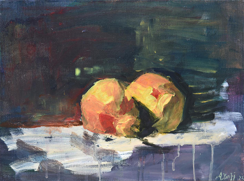 Με τα ώριμα κίτρινα, τα χυμώδη δαμασκηνιά, τα άγουρα πράσινα, οι καρποί της Αθηνάς Χατζή φαντάζουν σαν αυθύπαρκτα κατάλοιπα μιας συμβολικής απουσίας. Σπαράγματα αισθήσεων, τα συμβολικά αντικείμενα αυτών των τελετουργιών σε ημίφως, δίνουν σάρκα στην εντύπωση, εξαερώνοντας την ύλη.