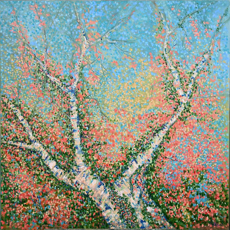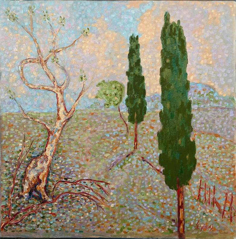 Όπως σημειώνει η ιστορικός τέχνης Βένια Παστάκα: «Η πινελιά του καλλιτέχνη κινείται στα πλαίσια του εξπρεσιονισμού και του πουαντιγισμού όπου άλλοτε με γρήγορες κινήσεις και άλλοτε με δουλεμένες κουκκίδες χρώματος συνθέτει το πολύχρωμο ψηφιδωτό του τοπίου. Το φως είναι ατμοσφαιρικό καθώς είτε προβάλλει μέσα από πυκνές φυλλωσιές είτε διαχέεται στο περιβάλλον μέσα από τους παστέλ τόνους του καλοκαιρινού ηλιοβασιλέματος. Οι τόνοι των χρωμάτων κυμαίνονται στις διάφορες τονικότητες του πράσινου και του γαλάζιου, των μαβιών, των πορτοκαλί και των ροζ, δημιουργώντας ένα συναίσθημα ηρεμίας και αισοδοξίας.